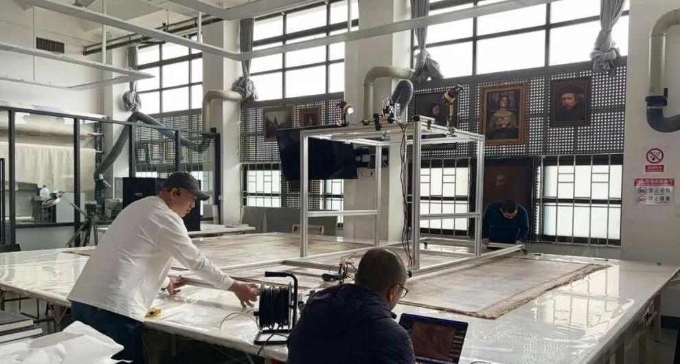 此次修复面临多重挑战,大尺幅操作便是难点之一。该画作尺寸达2.8米×4.8米,翻面、移动时极易受损。团队提前充分讨论操作方案,确保每一步流程安全;针对原木质画框易受潮生虫的问题,改用具备抗潮湿特性的铝合金画框,通过机械力均匀绷直画作,避免人力拽拉不均对画作造成损伤。在修复精度上,为避免损伤颜料层,团队前期开展大量科学检测,深入分析病害原因,依据检测结果制定精准修复方案;修复过程中若遇新问题,立即暂停作业、集体讨论,及时优化解决方案。