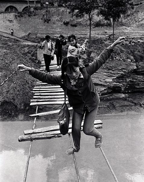 《上学》,1996年6月5日,陕北安塞县谭家营乡龙安村的一座小桥上,12岁的刘小花和39名同学胆战心惊地去河东岸的龙安中心小学上学。