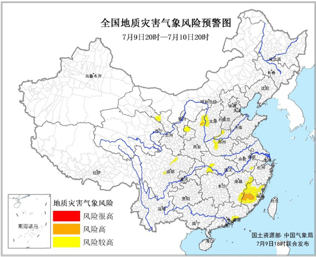 预计,7月9日20时至7月10日20时,甘肃中部、陕西东北部、四川盆地西部、河南北部、湖北西南部、安徽南部、江西东部、福建大部、广东中部沿海等地的部分地区发生地质灾害的气象风险较高,其中,陕西东北部、福建南部等地的局部地区发生地质灾害的气象风险高。请当地居民注意防范强降水引发的地质灾害,尤其是地质灾害隐患点附近区域。