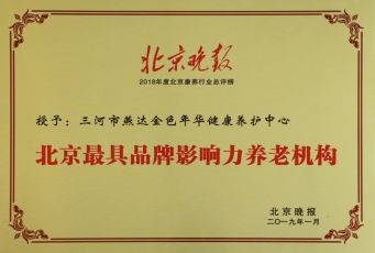2020年1月,燕达金色年华健康养护中心在“2019北京晚报‘品牌实力养老机构’年度总评榜”活动中,被授予“2019年度北京品牌实力养老机构”。
