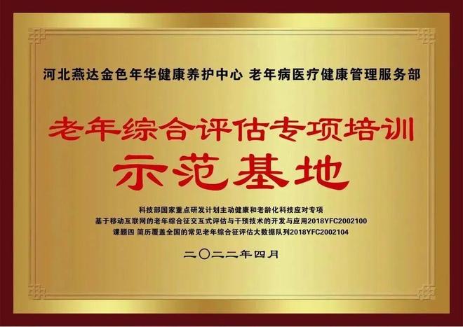 2017年11月,燕达金色年华健康养护中心被中国老年学和老年医学学会评为老年营养餐标准化示范基地。