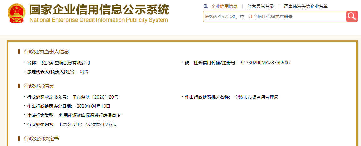 ●据国家企业信用信息系统,4月10日,宁波市市场监督管理局经随机抽样调查发现,部分空调检测结果与其能源效率标识上的信息不符,对奥克斯空调股份有限公司作出行政处罚决定:1.责令改正;2.处罚款十万元。