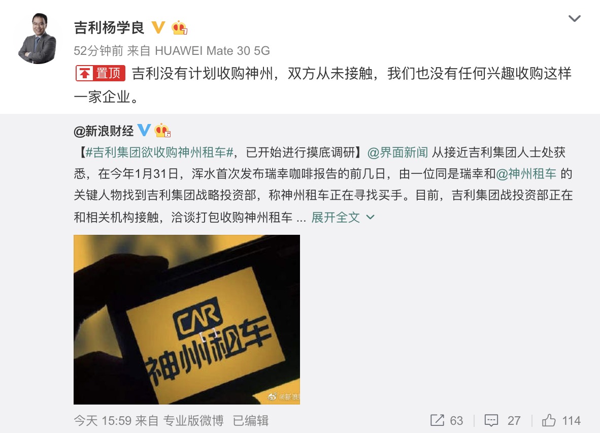 ●对于“吉利集团欲收购神州租车”的传闻,吉利汽车集团副总裁杨学良10日表示,吉利没有计划收购神州租车,双方从未接触,我们也没有任何兴趣收购这样一家企业。