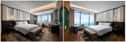 酒店拥有198间客房及套房,以德国工业质感与海浪温柔肌理为设计语言,全景落地窗框住浮山湾无界的天海一色,智能客控一键切换“观海模式”。夜卧床榻可听浪涛白噪音,晨起即见朝阳为海面镀上金箔,每一次呼吸都裹着海风的清冽。客房更搭载智能客控系统,客用品由机器人管家精准配送,科技与奢华于细节处交融,勾勒现代海居的智感美学。